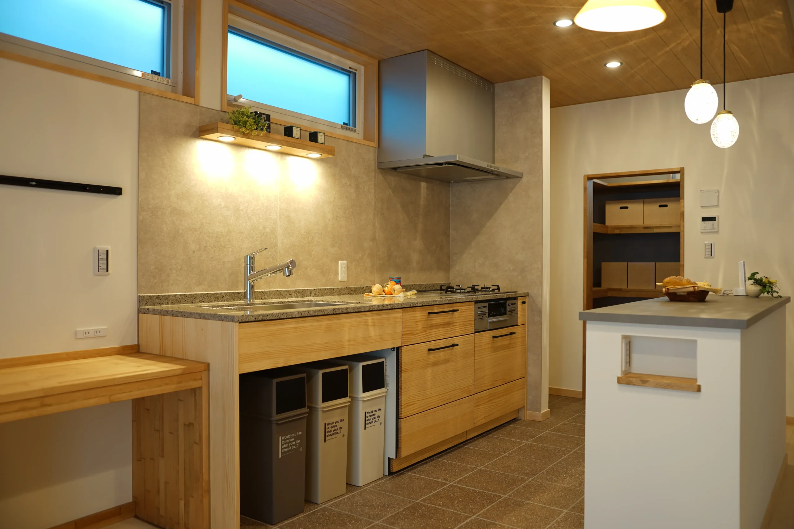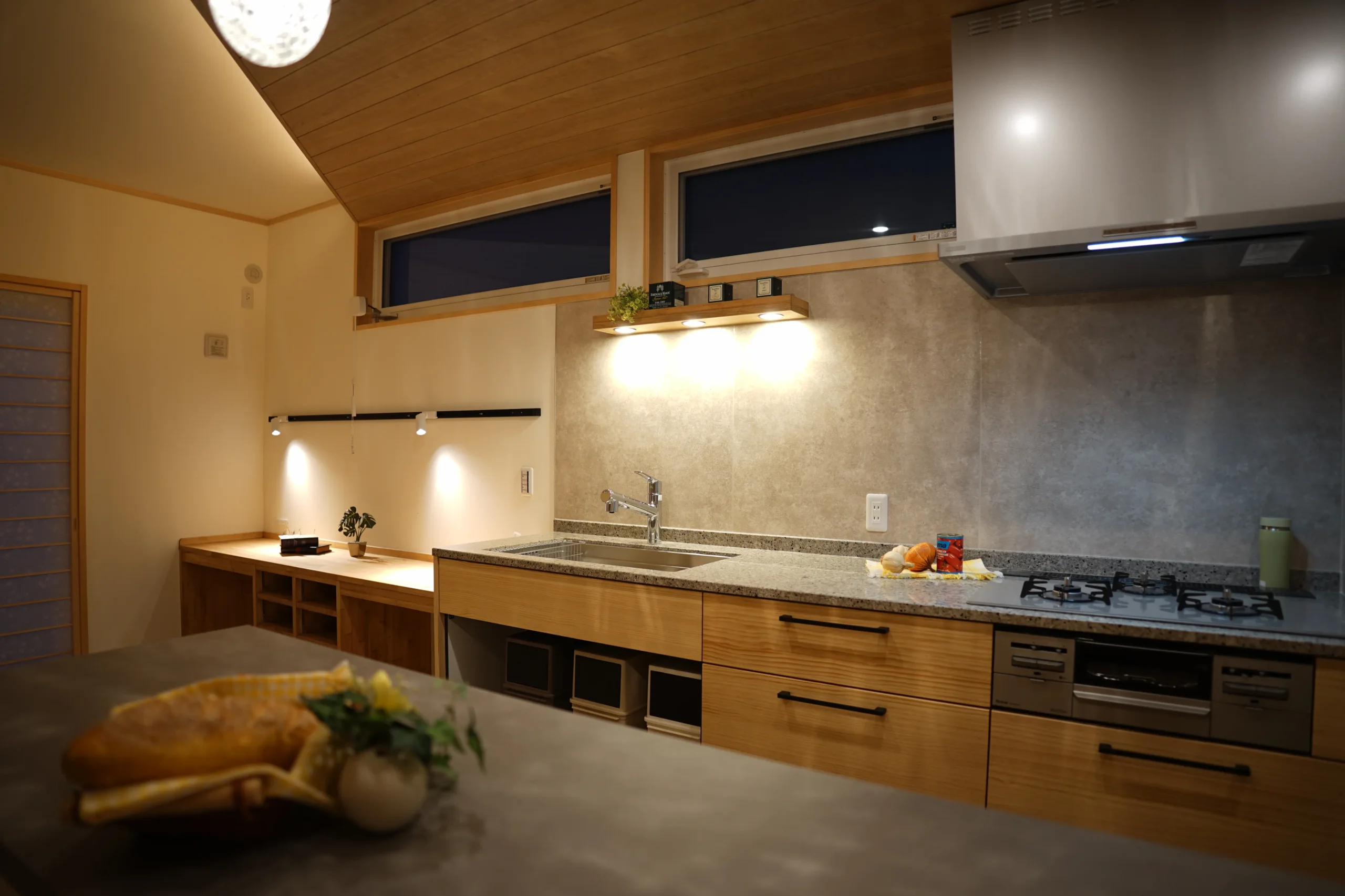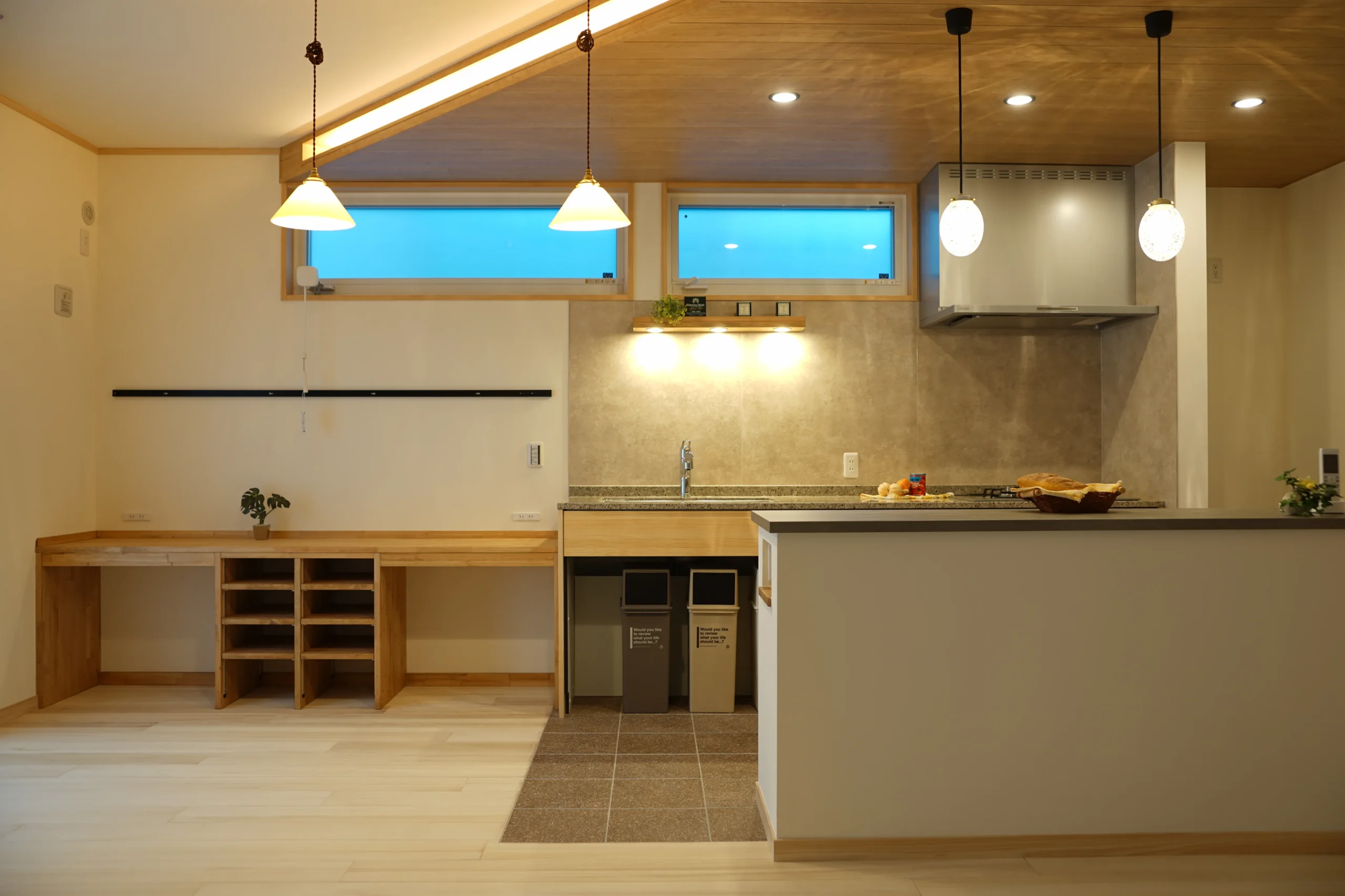 特にキッチンには、使い勝手の良い造作カウンターを設け、家族のコミュニケーションが生まれる空間づくりに工夫を凝らしています。