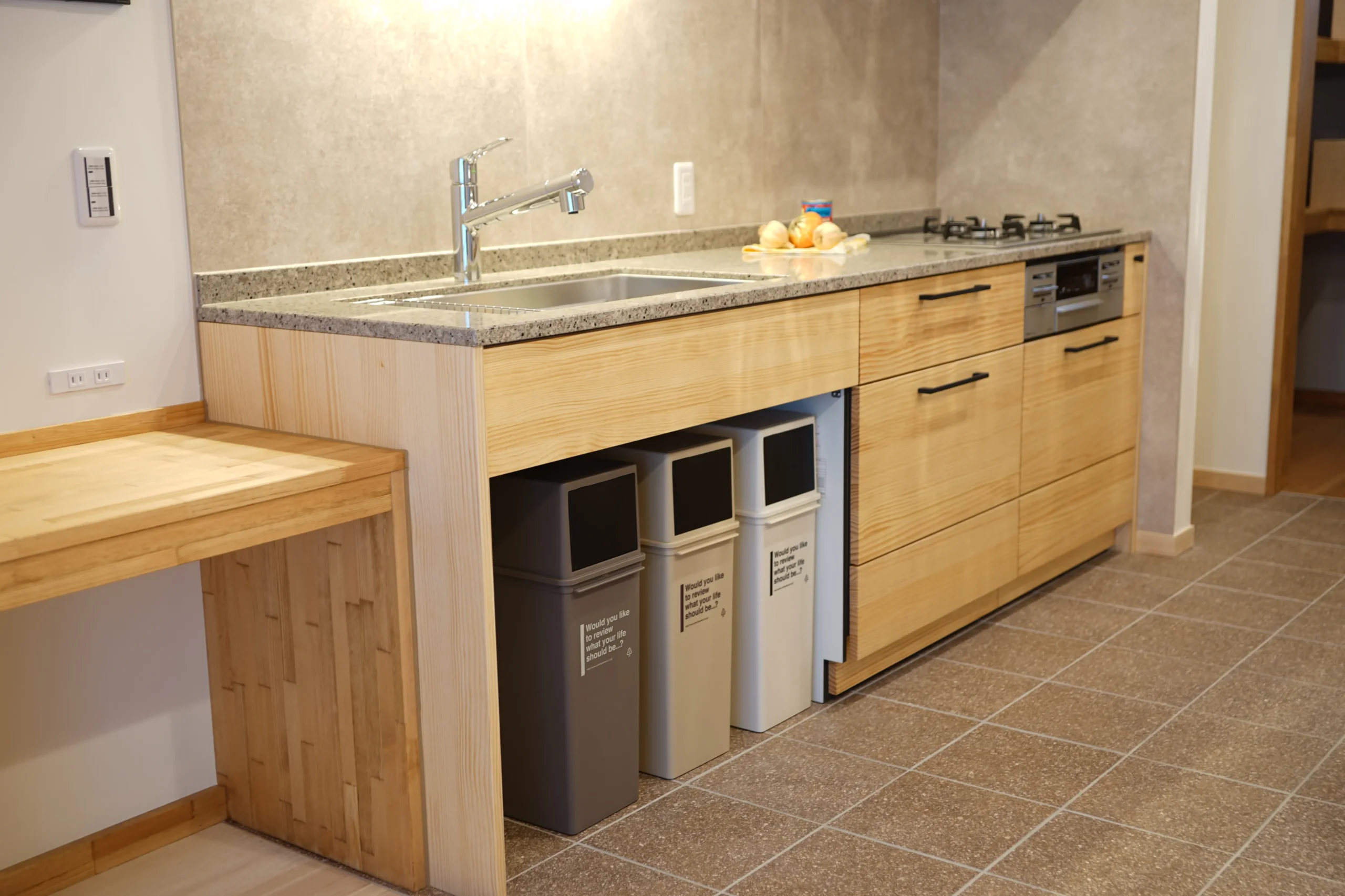また、シンク下には分別ごみ箱を3台程度収納できるオープンスペースが設けられています。