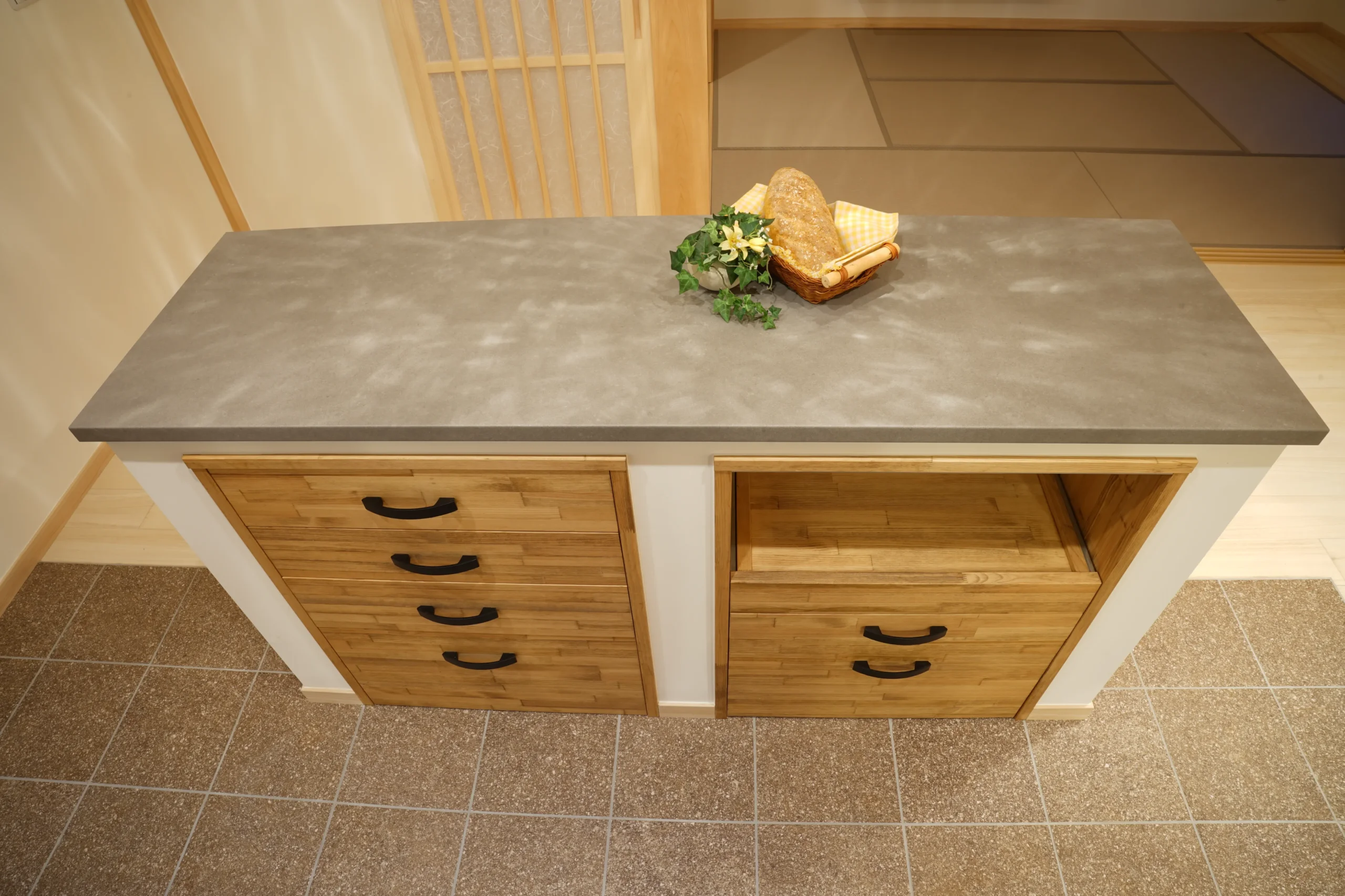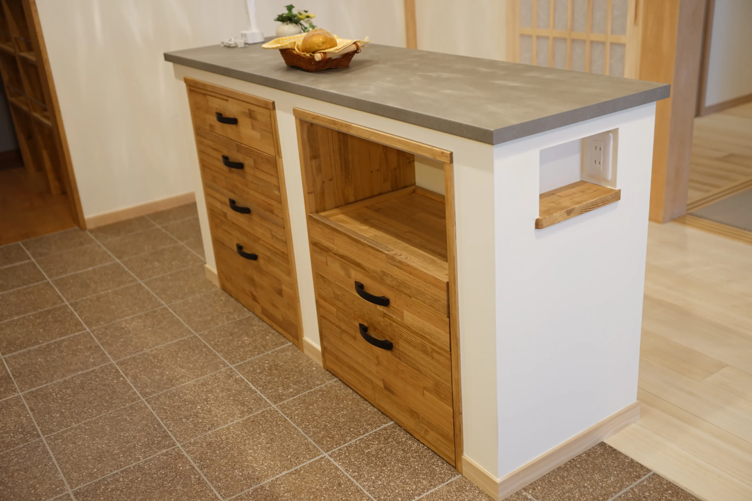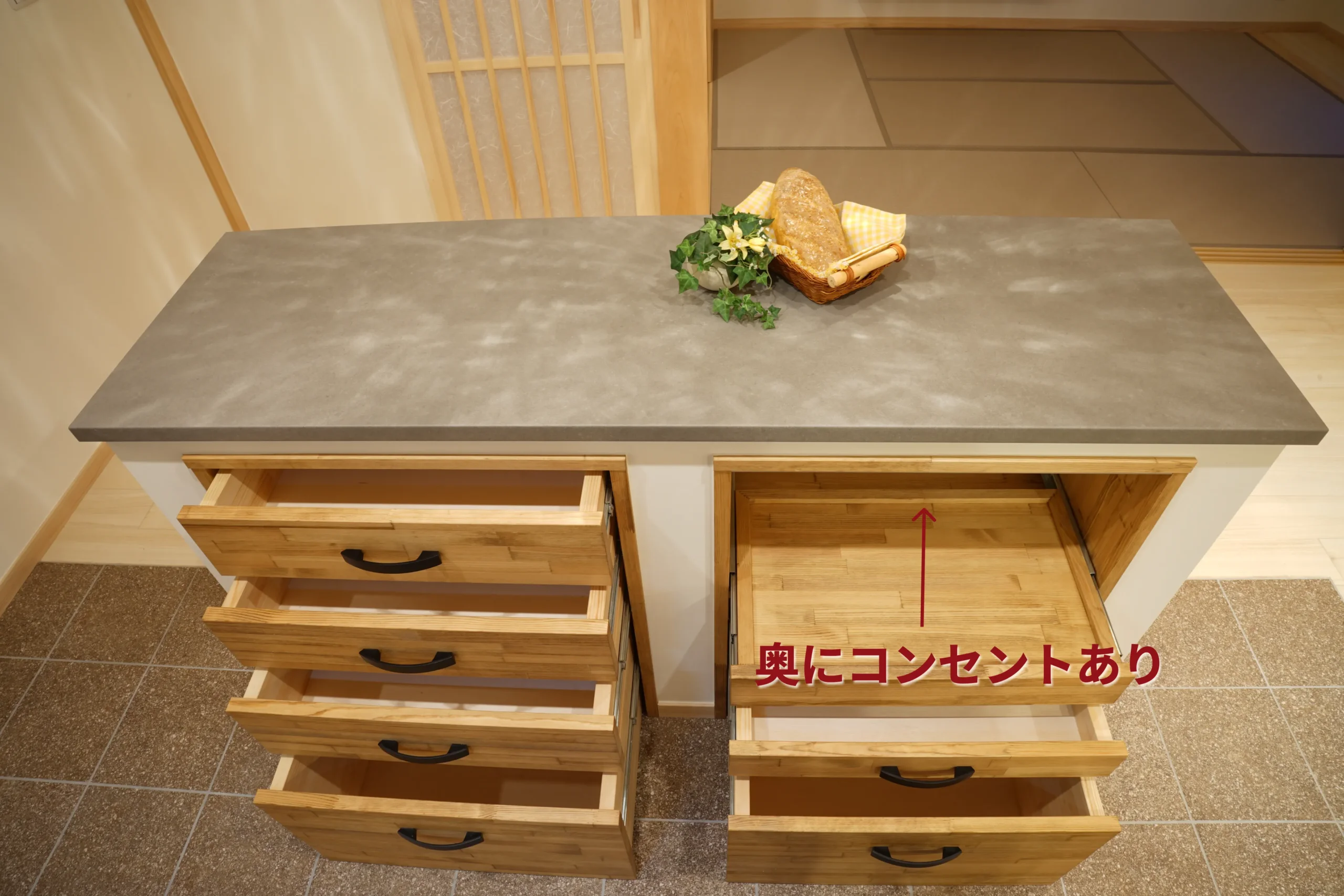 引き出しの右上部分には、炊飯器や電気ケトルなどを設置できるスペースを設けています。