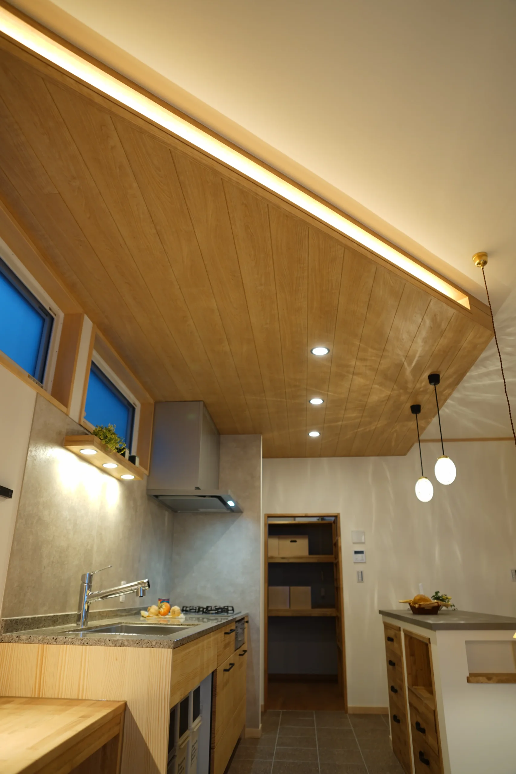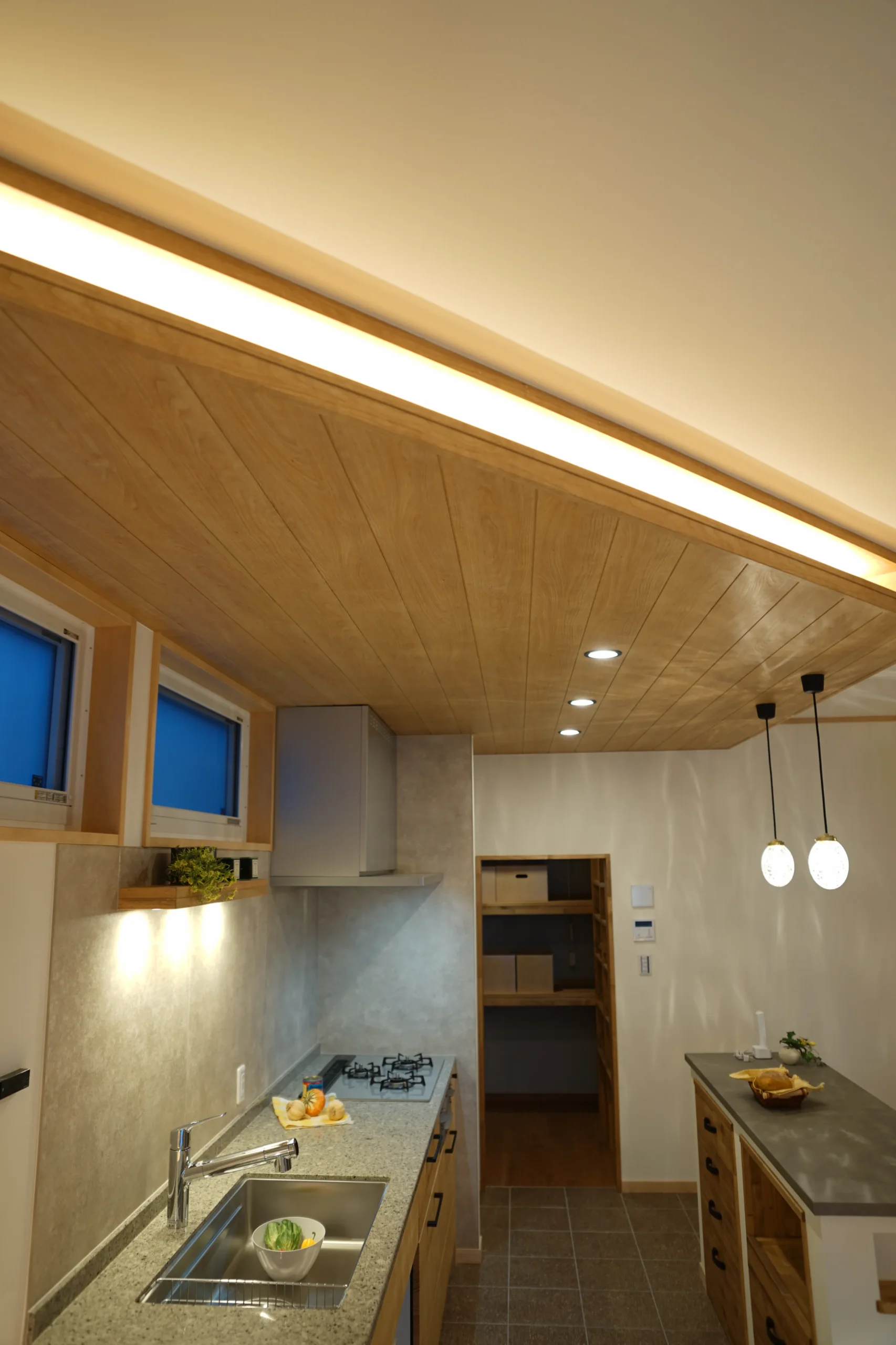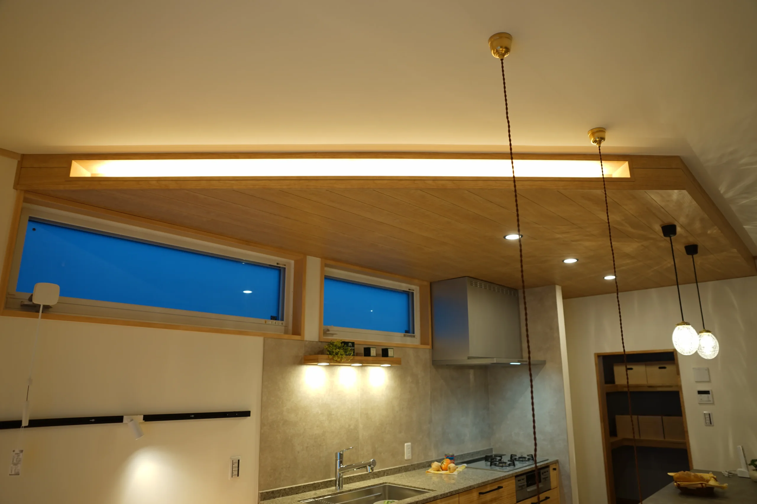 ただ明るく照らすだけでなく、空間全体の雰囲気を損なわないよう、キッチン前面の照明デザインにも配慮しました。