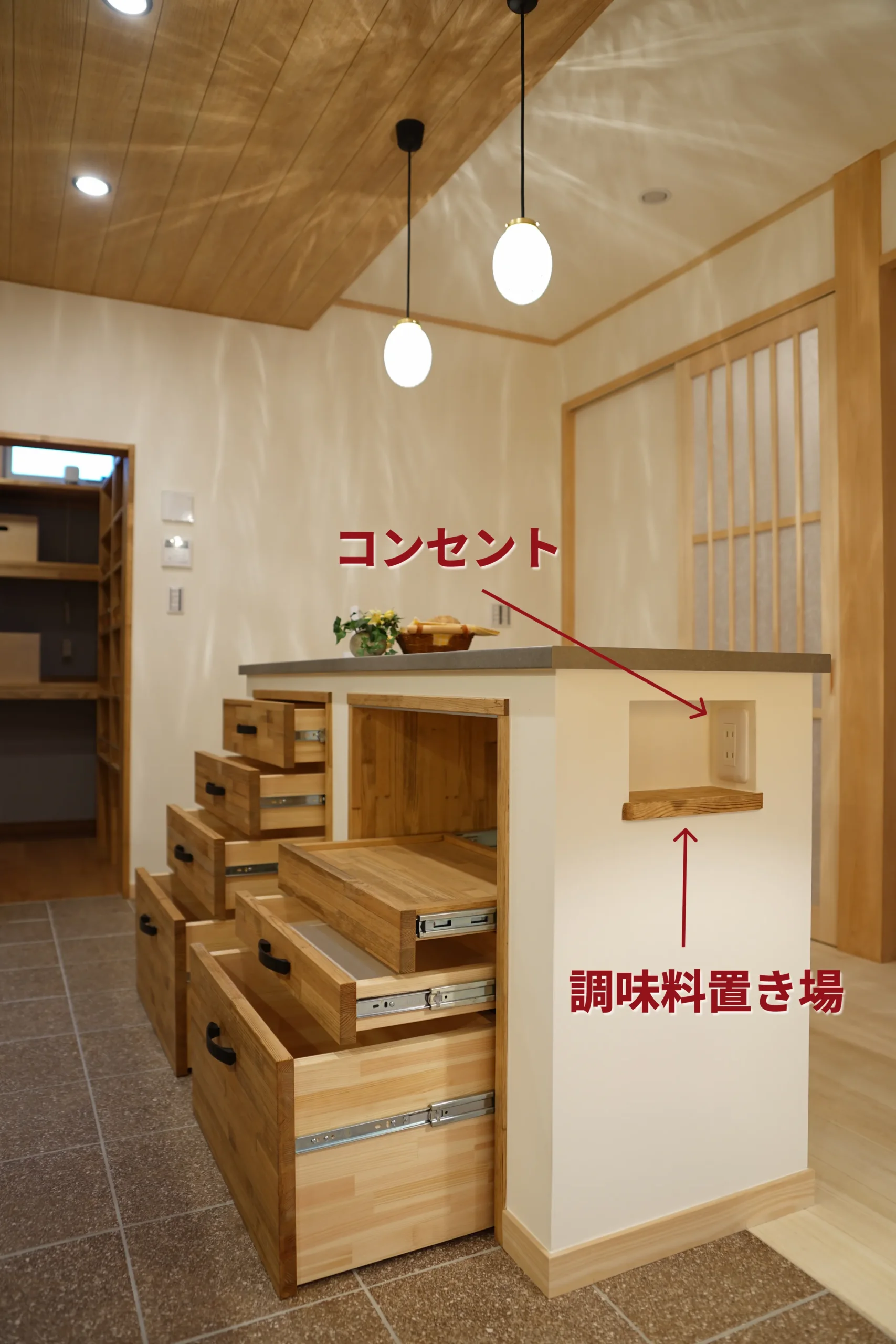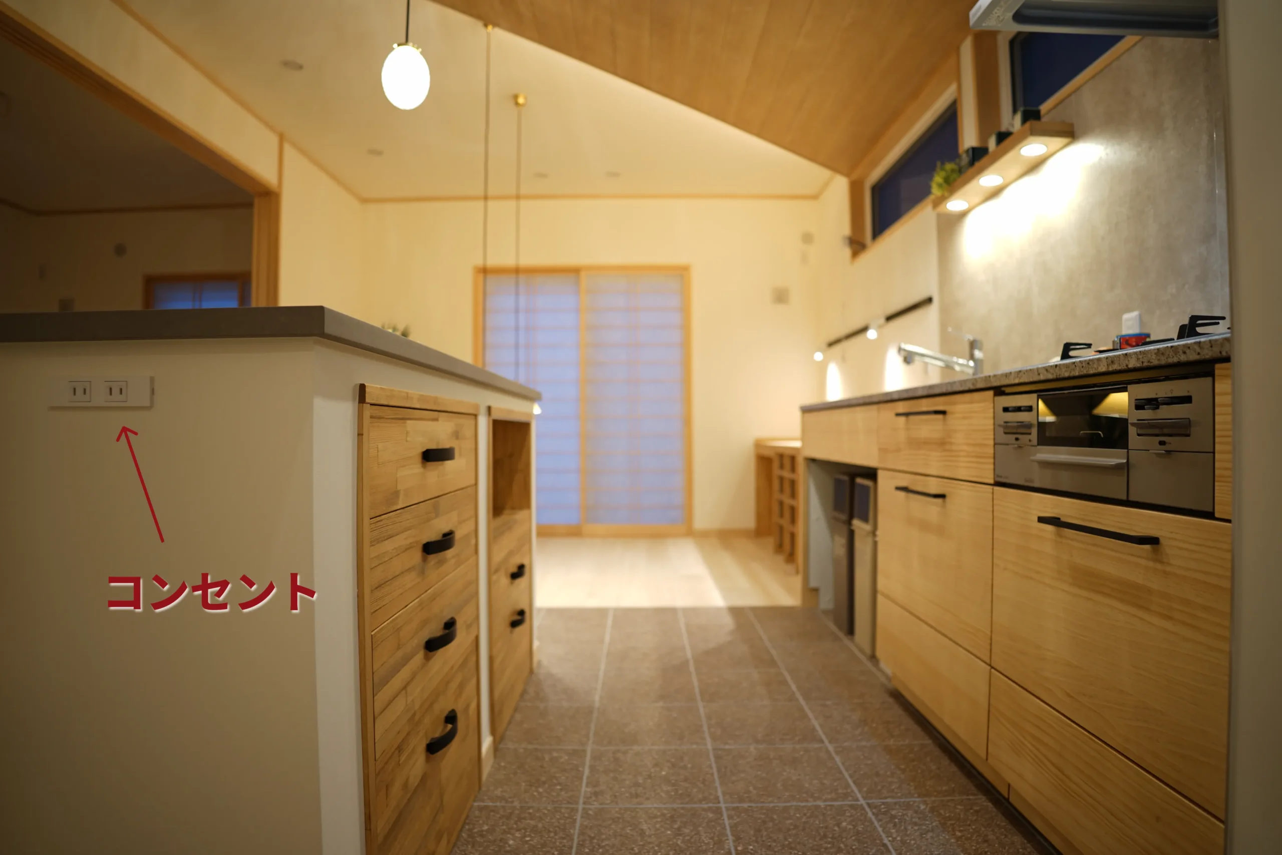 カウンターの側面にもコンセントを設けており、調理器具などを扱う際にも使いやすいよう工夫しています。