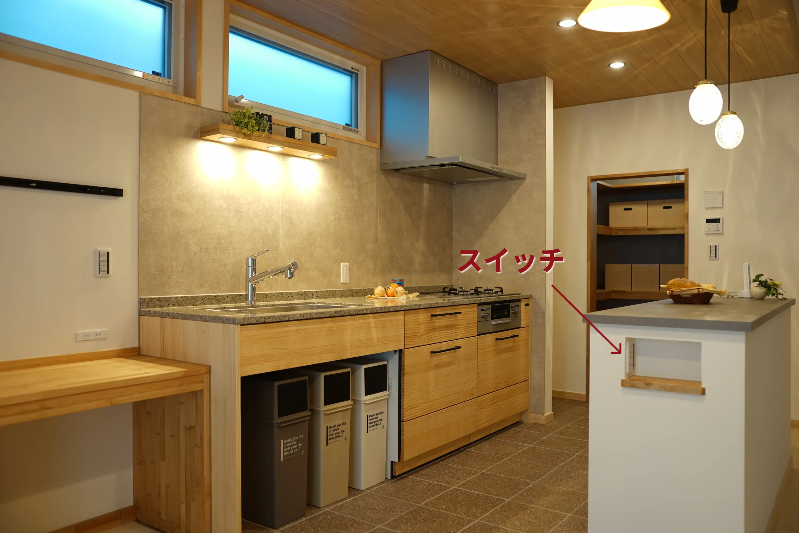 コンセントと照明スイッチも一体化しており、ダイニングテーブルを配置した場合にも非常に便利です。