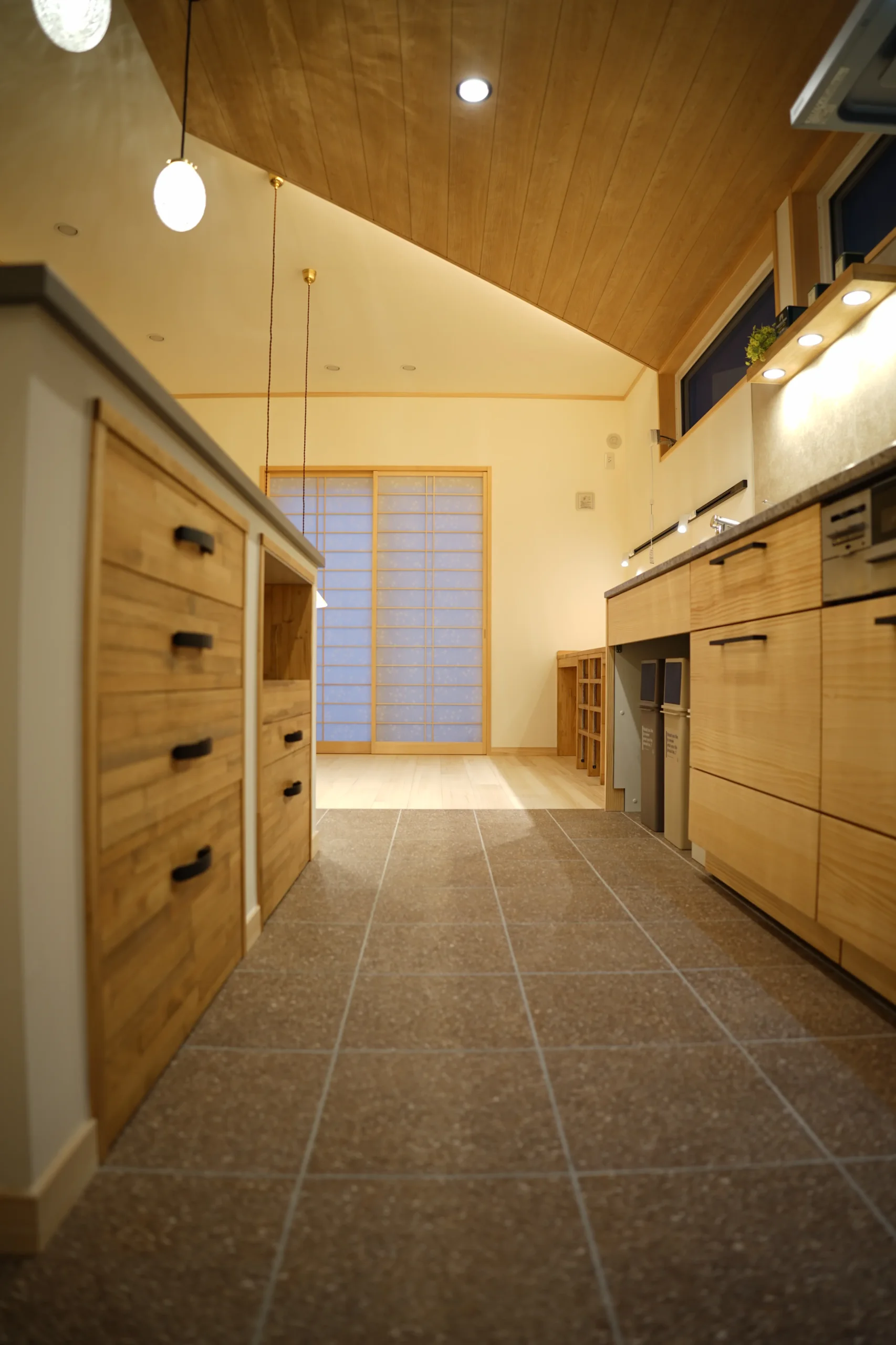 キッチンの床には、機能的でありながら見た目にも落ち着きのあるタイル仕上げを採用しています。