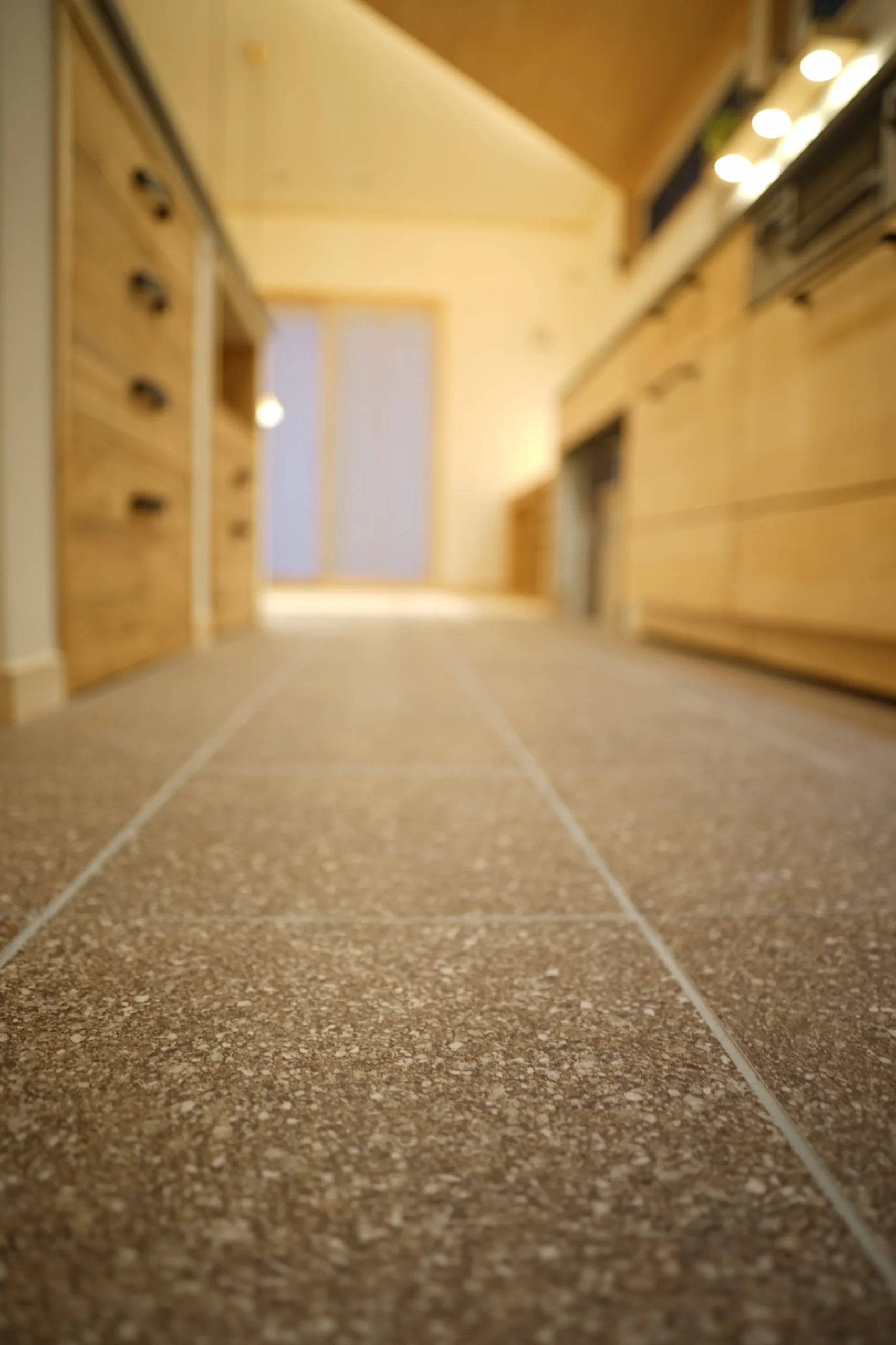 木のぬくもりを大切にした空間にタイルを組み合わせることで、デザイン性と実用性を兼ね備えた床仕上げとなりました。