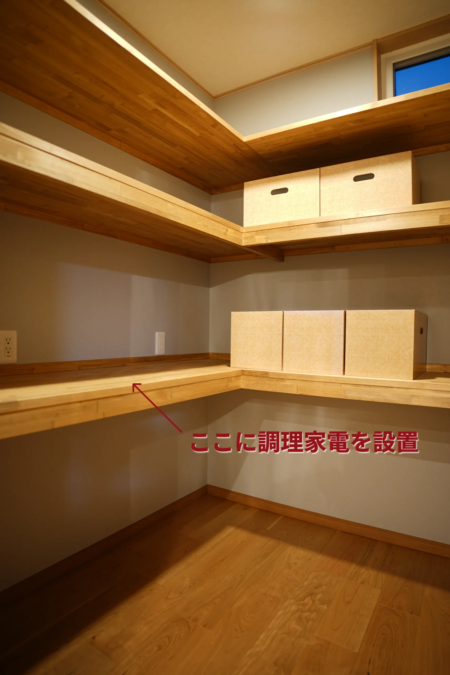 パントリー内には、電子レンジやオーブントースターなどを収納する専用スペースを設けました。