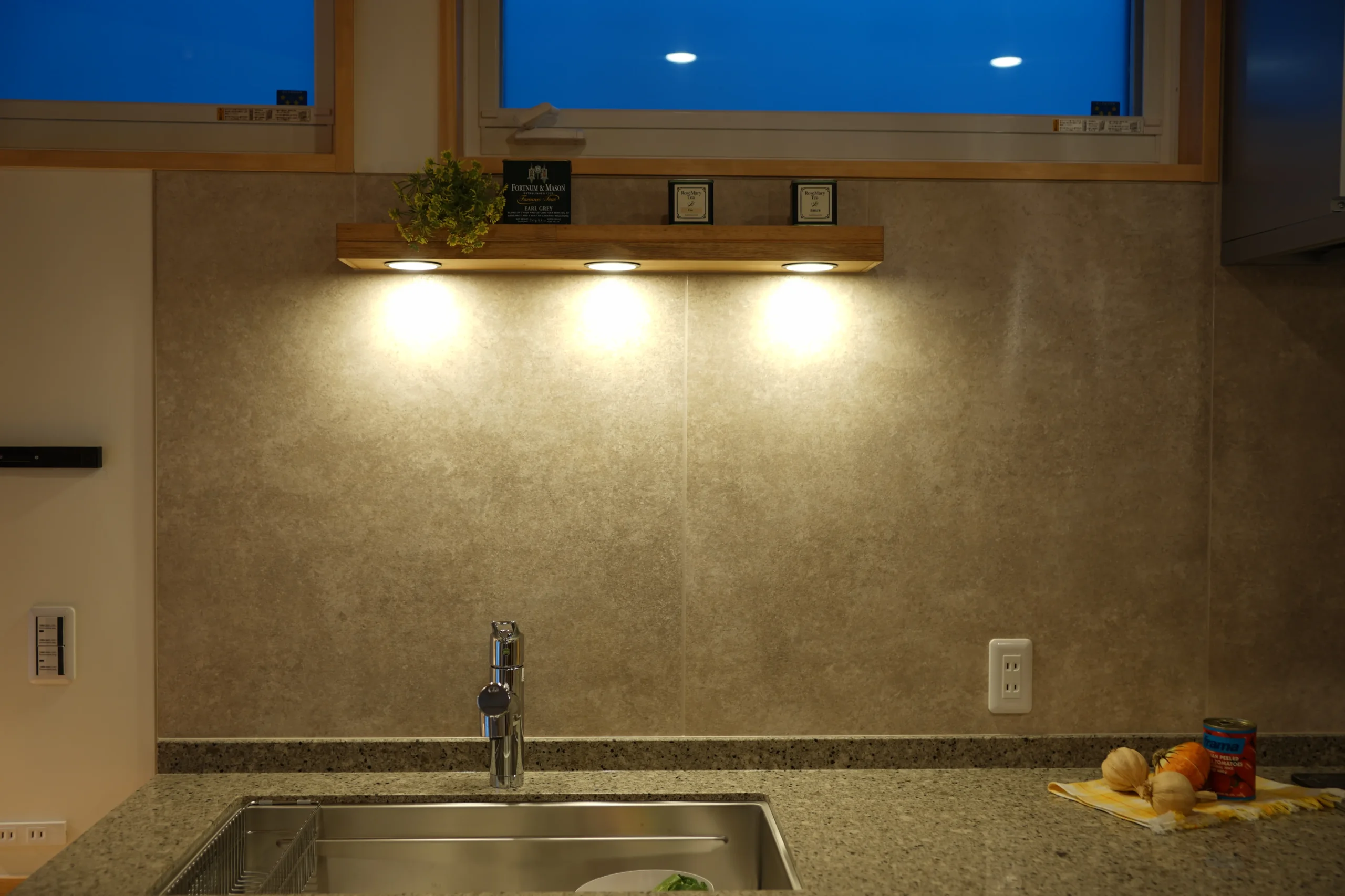 シンクまわりをピンポイントで照らしてくれるため、夜間の洗い物もストレスなく進められるようになっています。